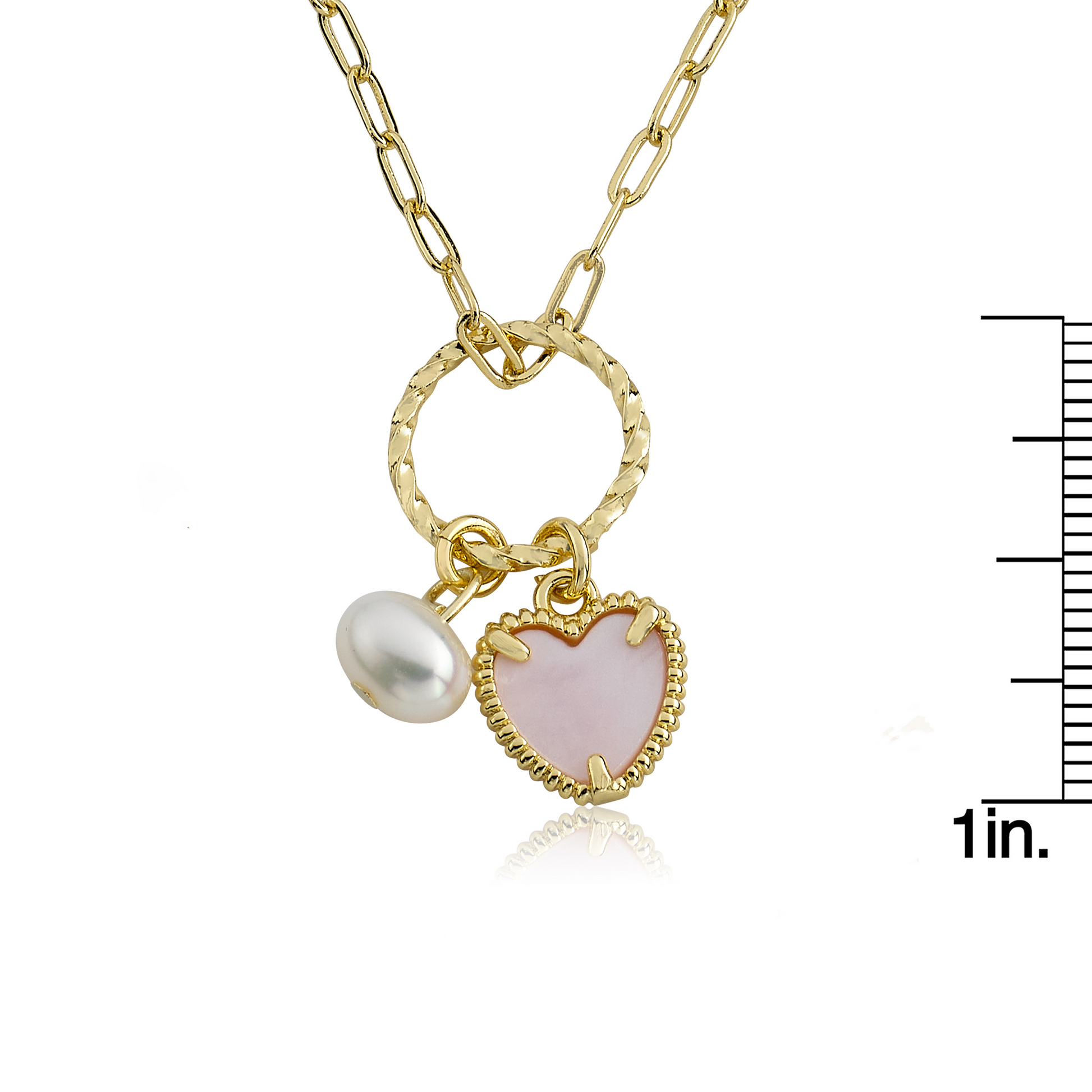 LMTS Classic! Paperclip Link Chain Necklace With Mother of Pearl Heart and Fresh Water Pearl on Rope Ring Pendant