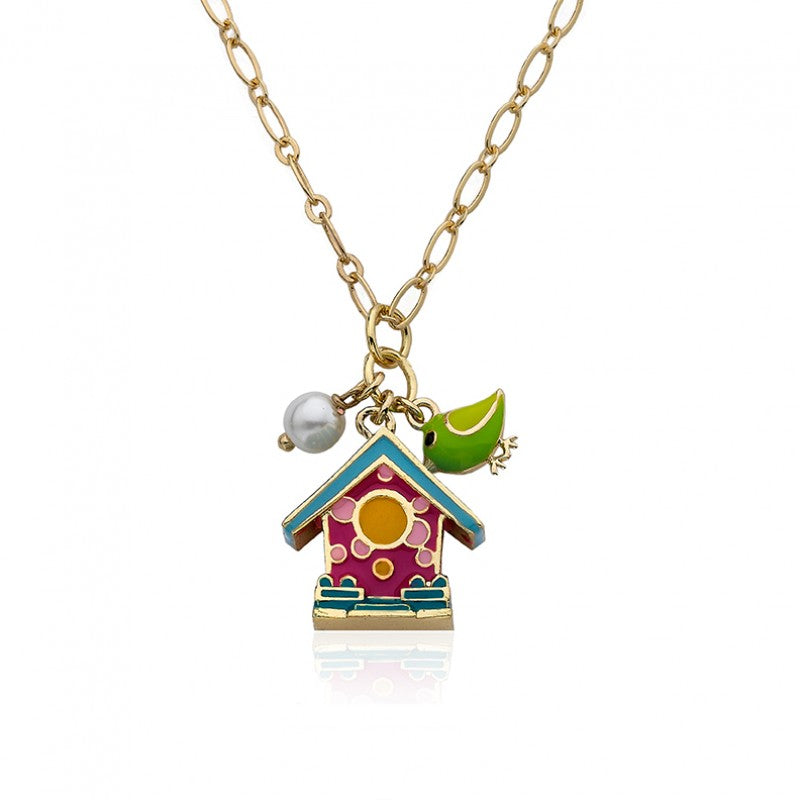 Hot Pink & Turquoise Birdhouse Charm Accented With Green Enamel Bird & Fresh Water Pearl Cluster Heavy Chain Necklace