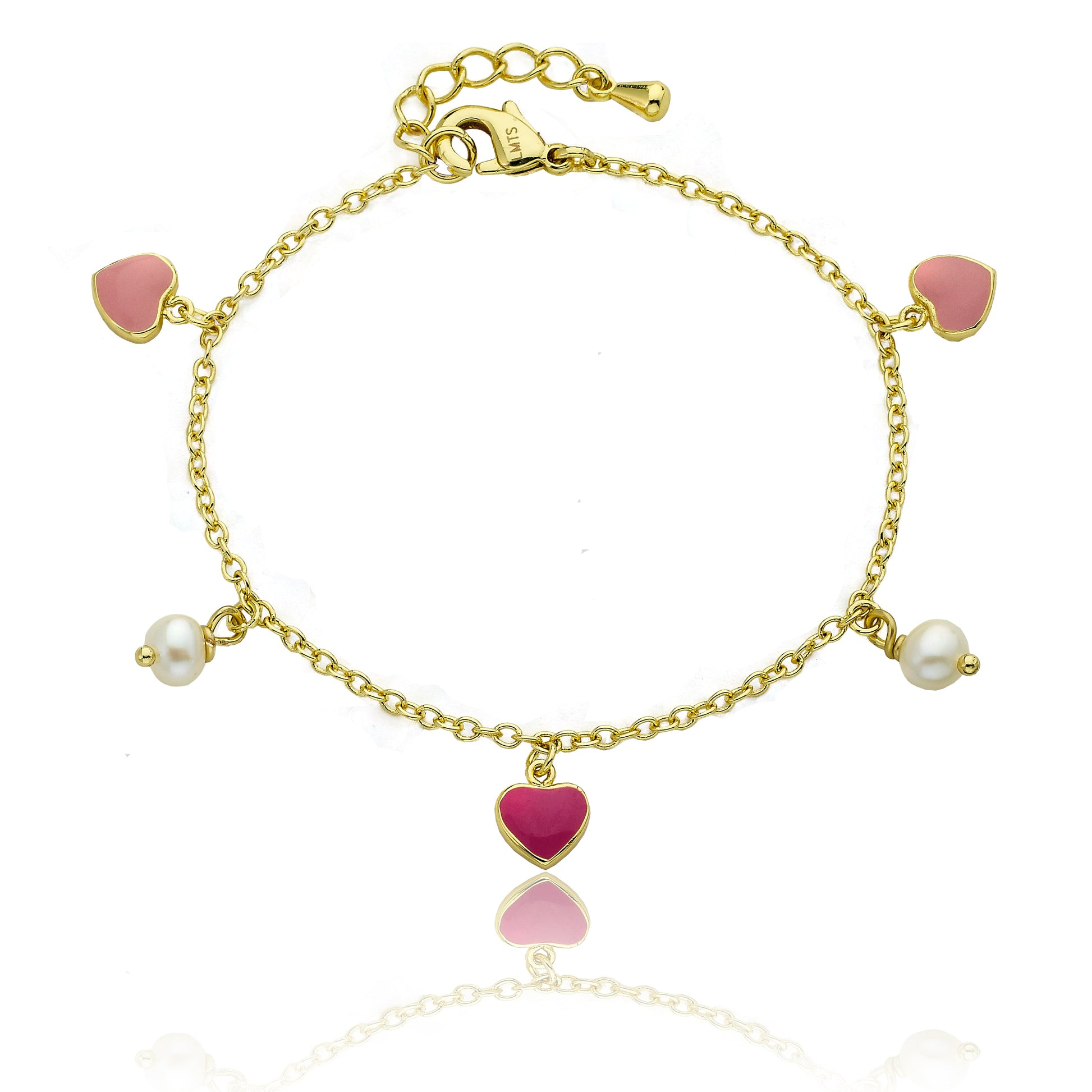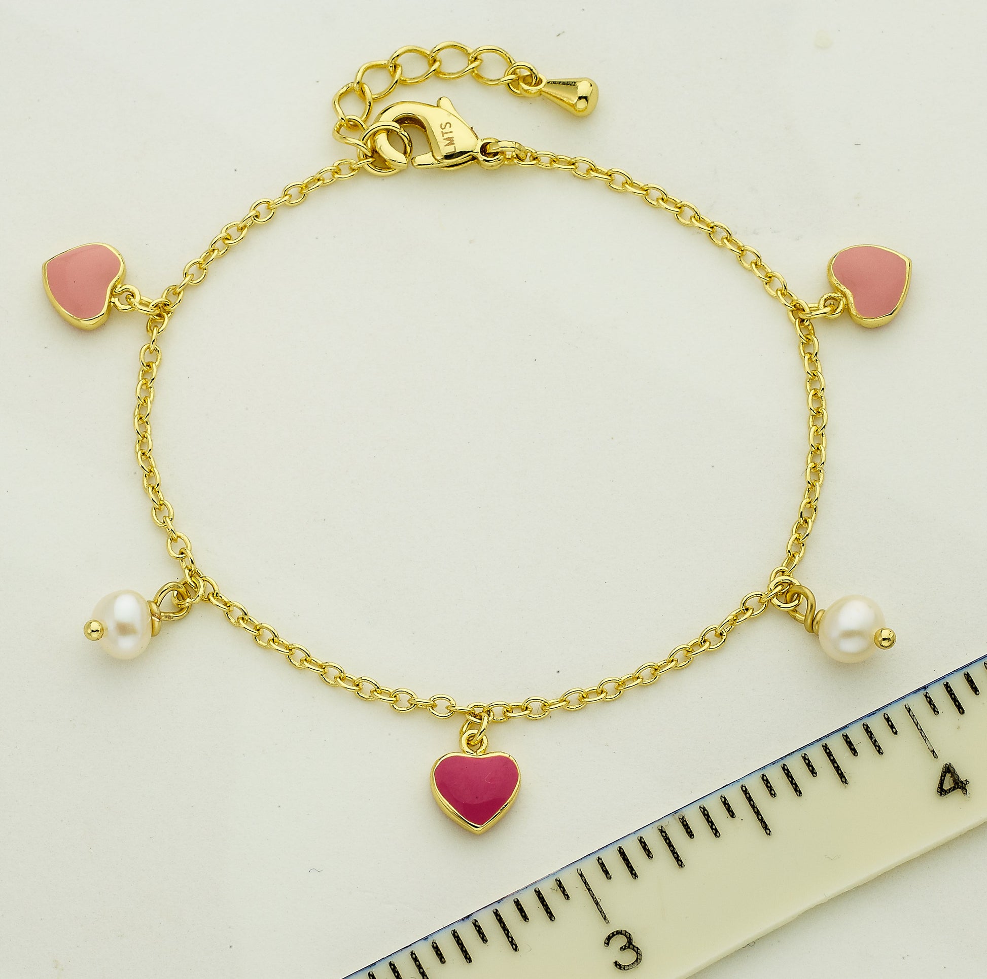 Description: 14K Gold Plated Pink & Hot Pink Enamel Heart Charm Bracelet Accented With Fresh Water Pearl Dangles