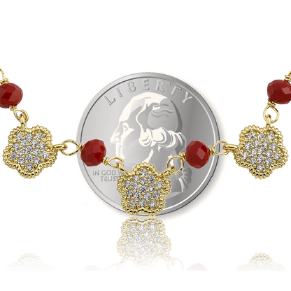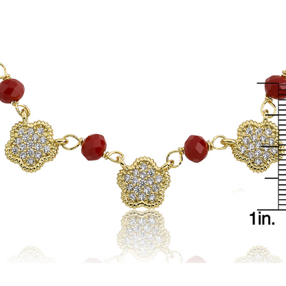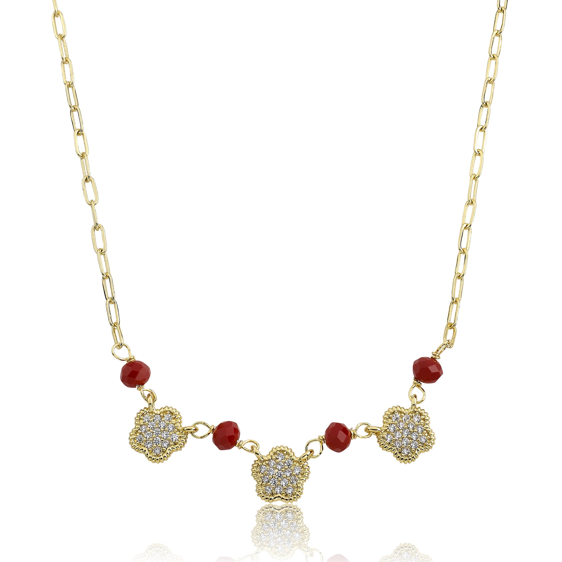LMTS Classic! Paperclip Chain Necklace With Alternating Micro Pave Cz Flowers and Red Faceted Glass Beads